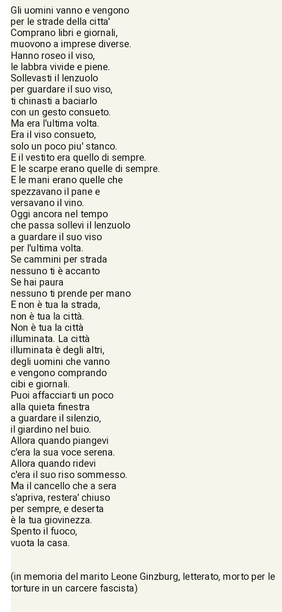 Leone Ginzburg, la Resistenza di un intellettuale - Collettiva Una lettera bellissima, una lettera d'amore nella quale pubblico e privato si intrecciano dando il senso della enorme levatura morale tanto del mittente quanto della destinataria. Natalia cara, amore mio, ogni volta spero che non sia l'ultima lettera che ti scrivo, prima della partenza o in genere; e così è anche oggi.