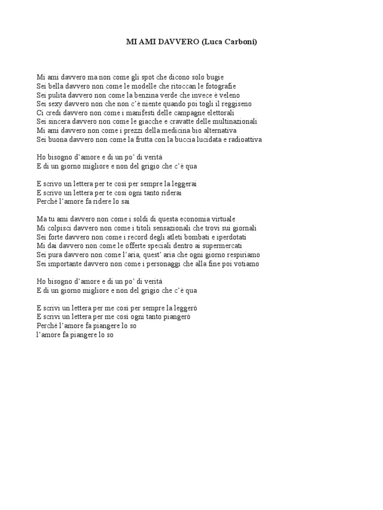 Mi ami davvero Songtext von Luca Carboni E scrivo una lettera per te. Così ogni tanto riderai. Perché l'amore fa ridere lo sai. Ma tu vali davvero. Non come i soldi di questa economia virtuale √ Mi Ami Davvero (testo) di Luca Carboni - Rockol E scrivo una lettera per te. Così ogni tanto riderai. Perché l'amore fa ridere lo sai. Ma tu vali davvero. Non come i soldi di questa economia virtuale